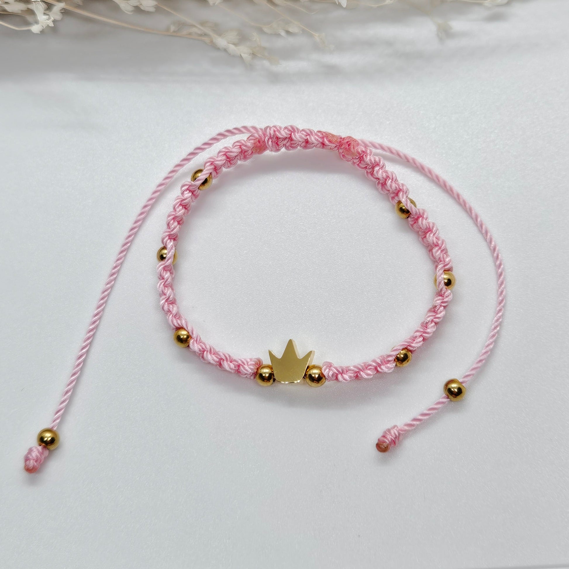 Tissé à la main en macramé et orné d’une petite couronne dorée, il apporte une touche romantique et raffinée à ton poignet. Léger et ajustable, il se porte seul ou en accumulation.