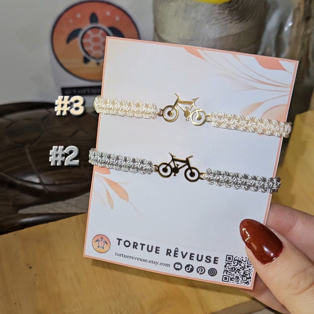 Célébrez la légende du Tour de France avec ces bracelets vélo en macramé faits main, inspirés des célèbres maillots de la course : le vert du sprinteur, le jaune du leader et le blanc du meilleur jeune. Chaque bracelet est tissé avec soin à partir de fil résistant, orné d'un médaillon doré en forme de vélo — un hommage à la passion du cyclisme et à l'esprit de dépassement.
